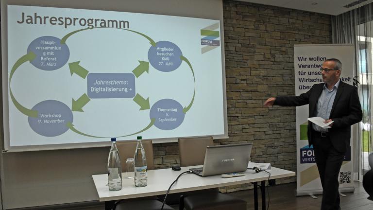 Im ausserstatutarischen Teil der 14. Mitgliederversammlung stösst Vorstandsmitglied Alfred Münger mit dem Thema «Ethik im Gesamtkontext des nachhaltigen Wirtschaftens» eine angeregte Diskussion an. Dabei wird einmal mehr ersichtlich, dass es rund um das Thema Ethik kein Richtig oder Falsch zu geben scheint. Jede Firma, jede Organisation, jede Gemeindeverwaltung sieht sich verschiedensten Herausforderungen gegenüber: Dennoch bringt der Austausch interessante Hinweise, wie situativ angepasste Lösungsansätze zu verstärkt ethischem Handeln am Arbeitsplatz führen können.
